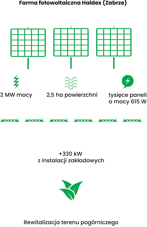 Farma fotowoltaiczna Haldex zajmuje powierzchnię ok. 2,5 hektara i dysponuje zainstalowaną mocą około 2 megawatów. Energia elektryczna wytwarzana jest z kilku tysięcy paneli fotowoltaicznych o mocy jednostkowej 615 W. Instalacja została wpięta do sieci dystrybucyjnej jako „Elektrownia PV Haldex ZY 110” i od początku 2025 roku produkuje energię przeznaczoną do sprzedaży.